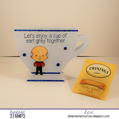 I went on-line and found a tea cup template and printed it out. After folding a piece of light blue cardstock, I laid the template along the fold and cut out my cup. I had found some narrow sparkly washi tape in Hobby Lobby last week, and it looked like the perfect trim for my tea cup. I then glued down my fussy-cut captain onto the cup and popped on some sequins.