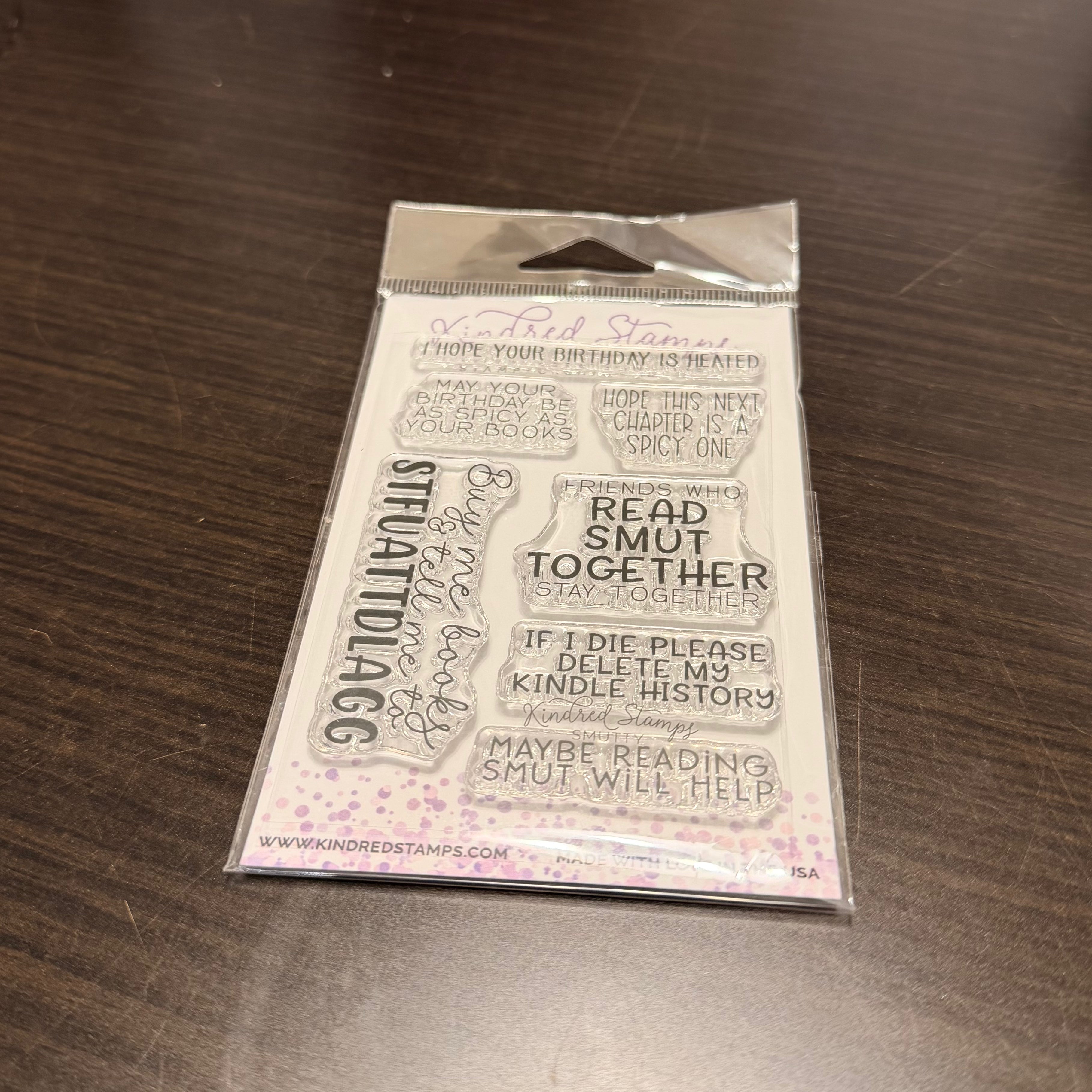 “Smutty” is a 3" x 4" stamp set made of high-quality clear photopolymer and lovingly produced in the USA.